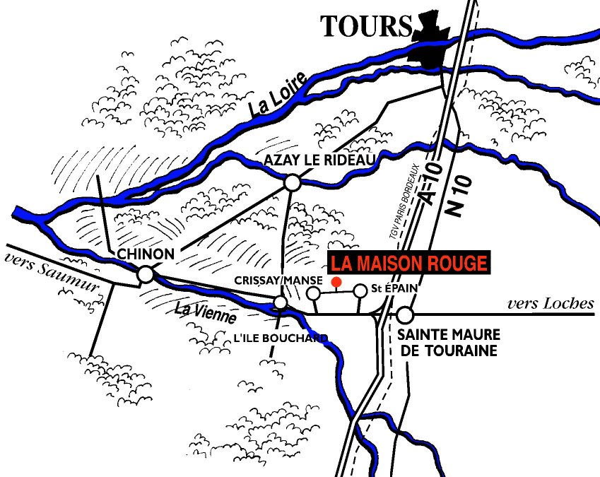 To come from TOURS by the highway: - On highway A10 take the exit number 25 "Sainte Maure de Touraine", 40 km south of Tours - After the toll-gate, take left, direction "Chinon" and "Saint Epain" - Keep on the direction of Saint Epain, passing two roundabouts and driving around 9 km - Cross the main street of the village of Saint Epain, passing in front of the church and the town hall - Turn left on the road D21, direction "Crissay/Manse"; a sign "chambres d'hotes" indicates the direction - 2 km after Saint Epain, turn right on the sign "La Maison Rouge"; we are the last house at the top of the hill!